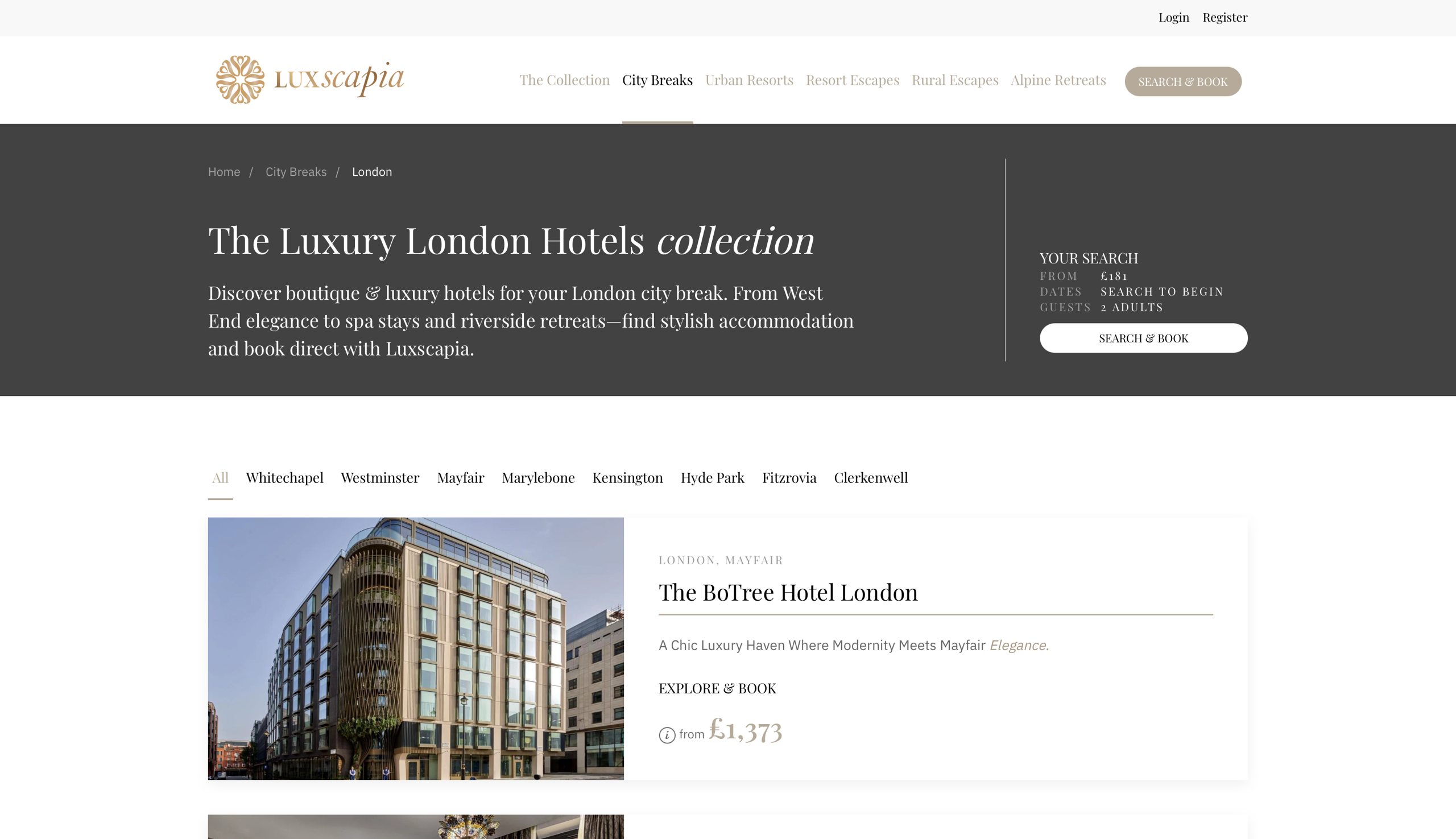 The image above showcases an implementation of Luxscapia, a curated collection of the worlds finest luxury & lifestyle hotels.